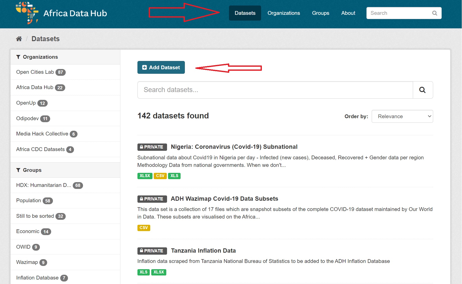 Uploading data to the ADH CKAN platform is really easy. First, click on the datasets