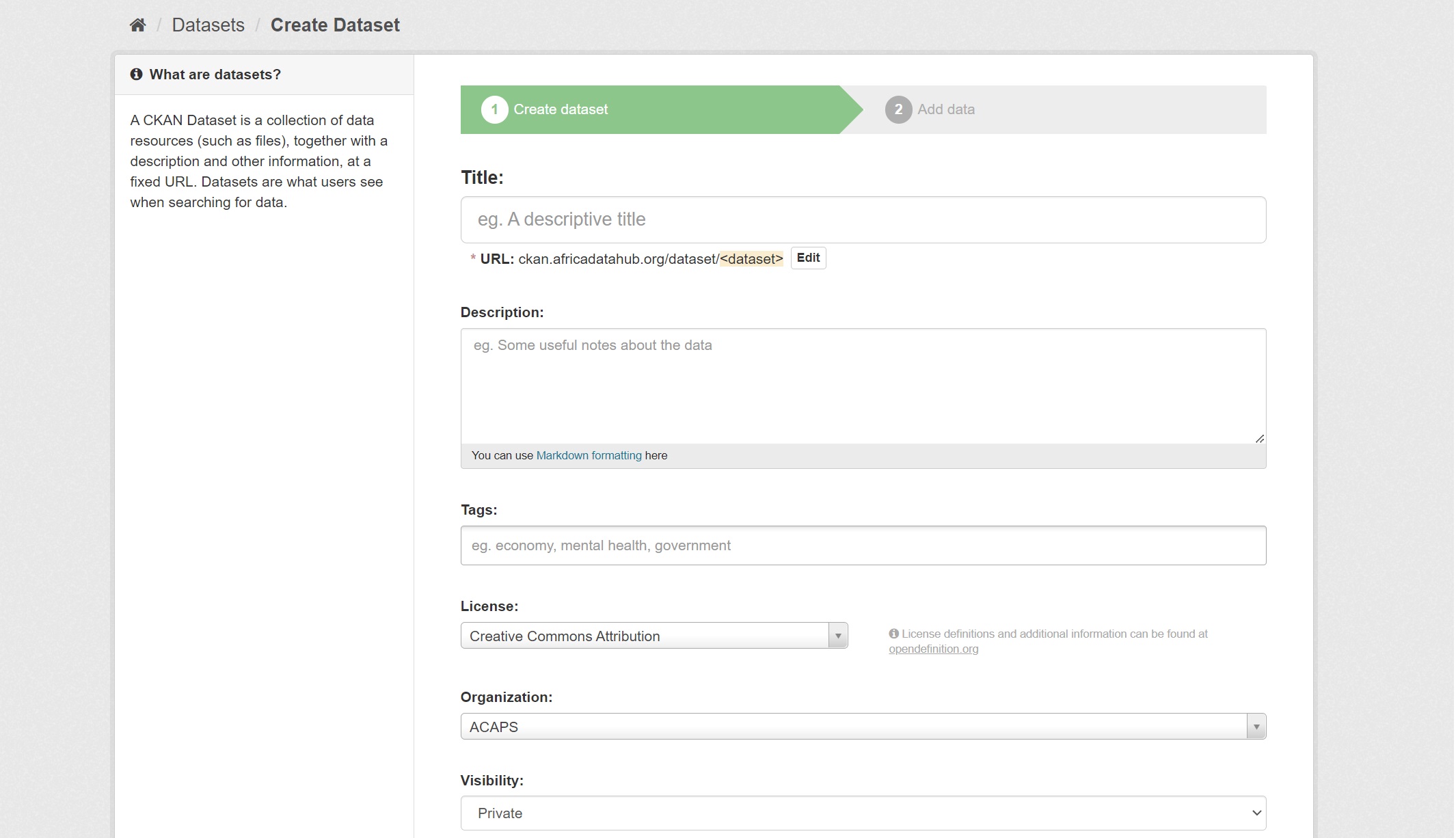 data etc. A dataset may belong to more than one group. Groups also serve as folders for all datasets used in a particular data tool or project. Finally, if several different datasets have all been sourced from the same place, then all of those datasets are placed in a group named after that source. See for example, the Humanitarian Data Exchange, and the accompanying blog postENTER PUBLISHED LINK HERE.