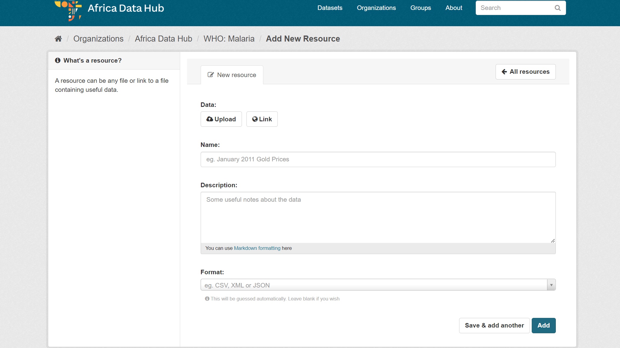 Give your data file a descriptive name and a good description and then either upload your file or link it via URL. Click on Save & add another